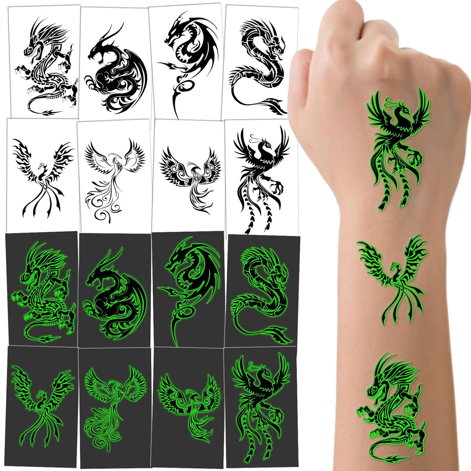 16 Sheets Luminous Dragon Phoenix Temporary Tattoos Glow in The Dark Dragon Birthday Party Decorations Supplies Favors for Kids Adults, Goodie Bag Fillers