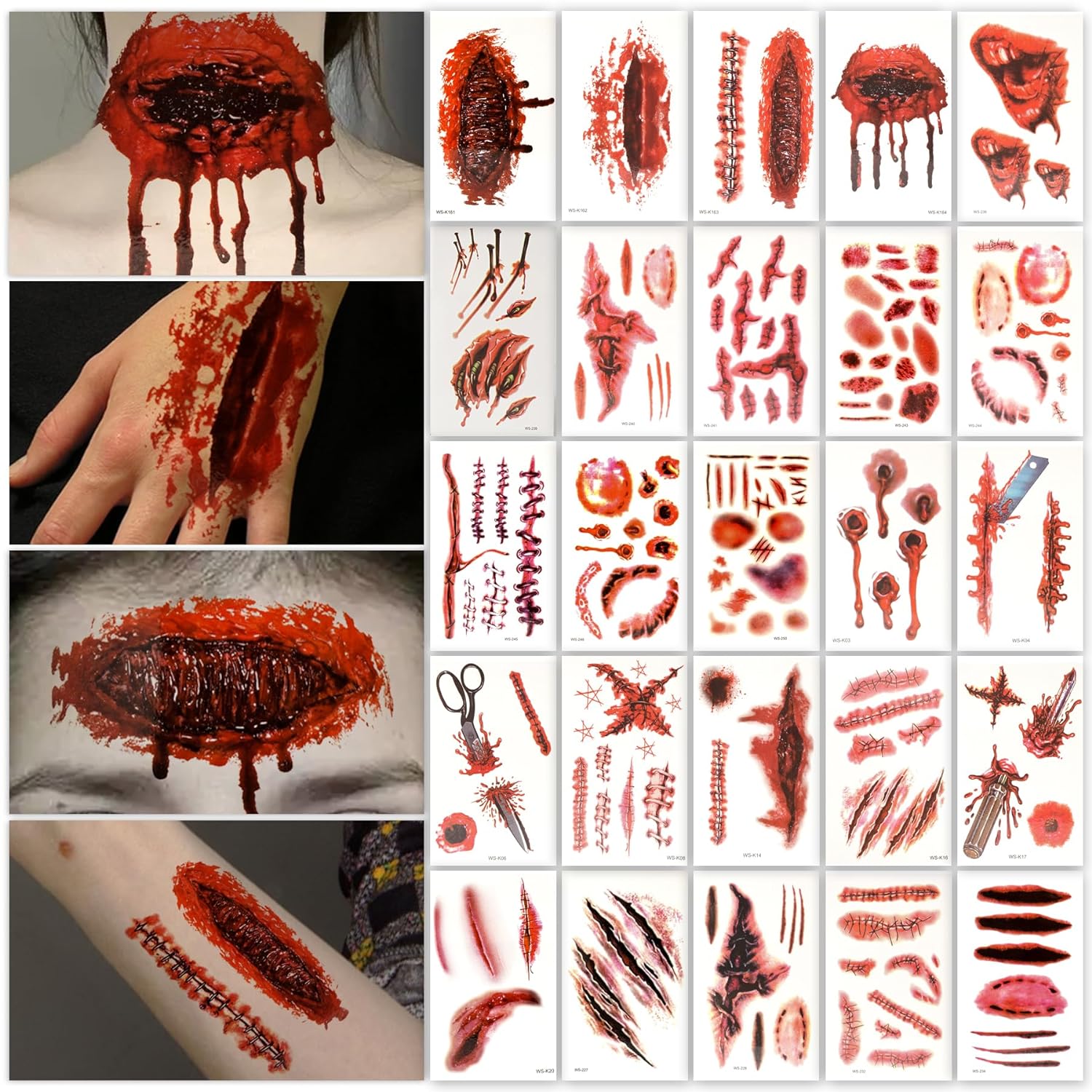【REALISTIC ZOMBIE TATTOO KIT】Come with 25 sheets Halloween scar tattoos. The 3D design and clear ink makes scar wounds look more realistic and natural, present a more shocking and realistic effect and giving you a better dress up experience. The patterns like big bloody wound, bite mark, cut, scar, stitches, scratch, and so on! Unforgettable Halloween experience start with it.