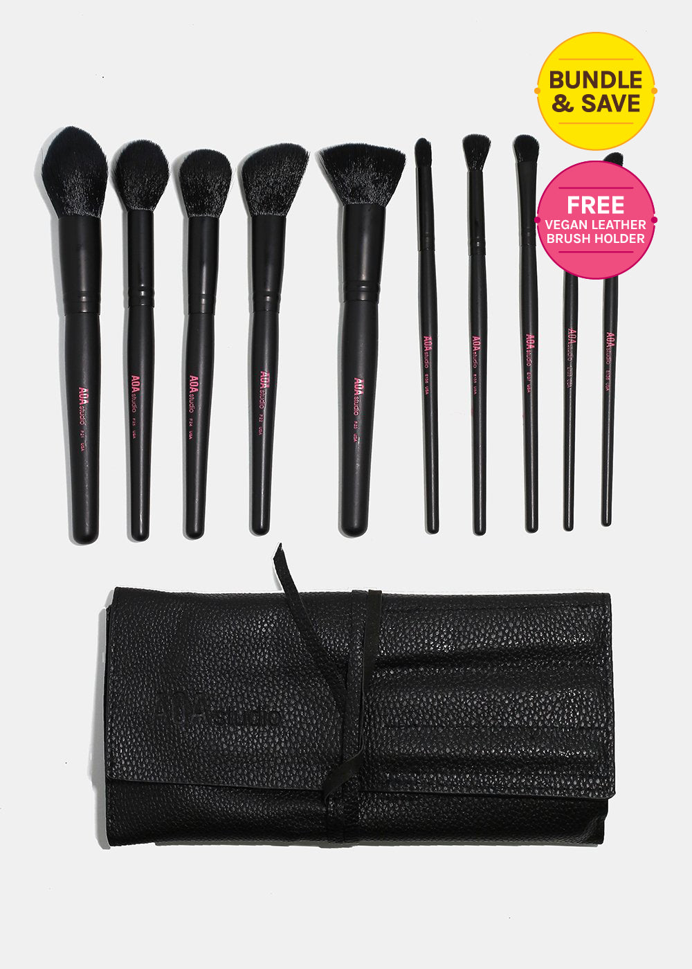 This is the full set of 10 AOA studio brushes- 5 Face brushes and 5 Eye Brushes. When you purchase the full set you will receive a new style AOA black, vegan, leather brush roll for free! The super soft, flexible, black, vegan-leather brush roll keeps brushes organized and clean so you can take your brushes with you anywhere. Roll, tie and go!