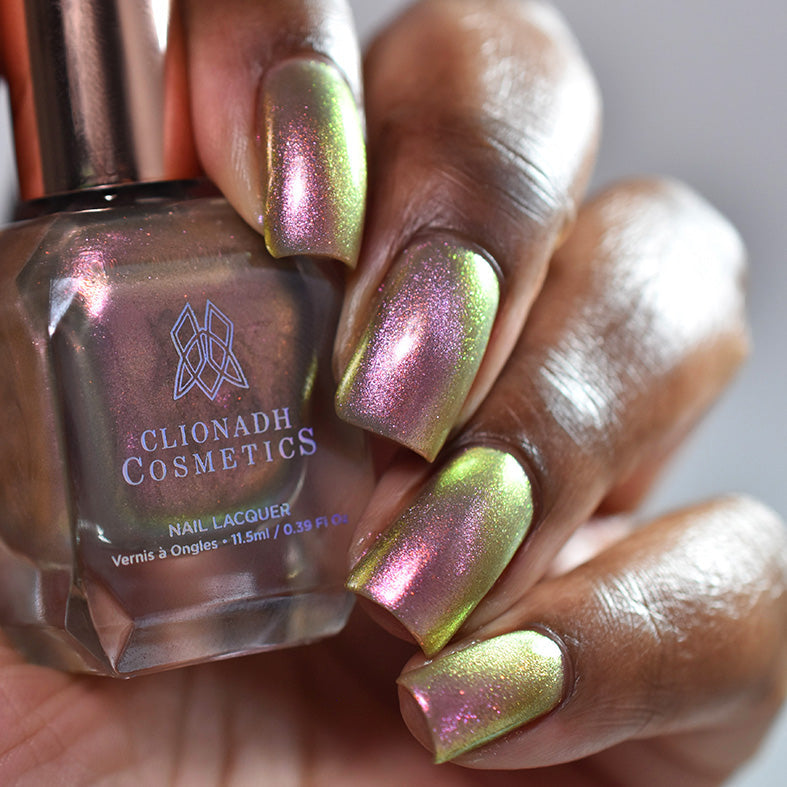 Style your nails with this multichrome nail polish that has a semi-sheer taupe base, along with color-shifting shimmer of pearlescent pink to peach to gold.?