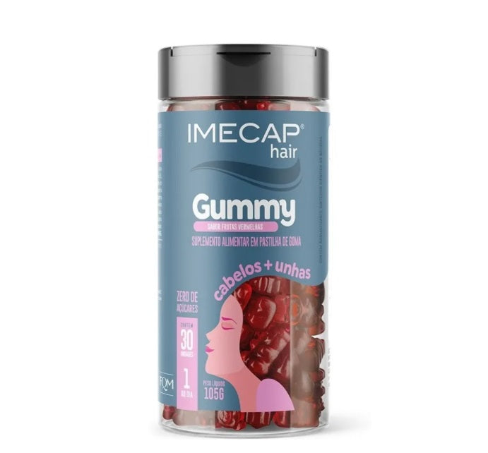 Imecap Hair Gummy has in its composition: Biotin, Vitamin E, Vitamin B12, Zinc, Vitamin A, Vitamin D3, Vitamin B5 and B6, Hydrolyzed Collagen and Vitamin C. It helps to strengthen hair and nails.