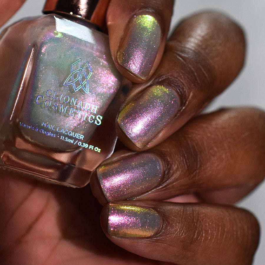 Step into the realm of ethereal beauty with this jewel-toned polish that captures the essence of stained glass allure. Its transparent base serves as a canvas for the enchanting shifts of pink, red, orange, and yellow, reminiscent of the vibrant hues found in cathedral windows at dawn.
