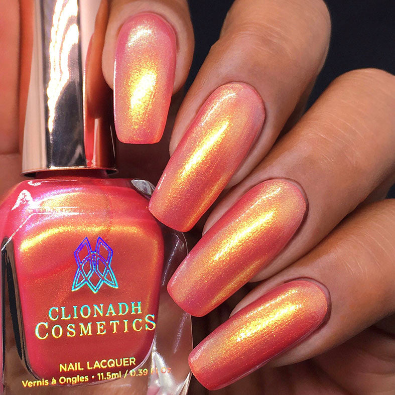 A multichrome nail polish that screams beauty, a red base with color shifting shimmer of gold and light green to paint your nails with.?