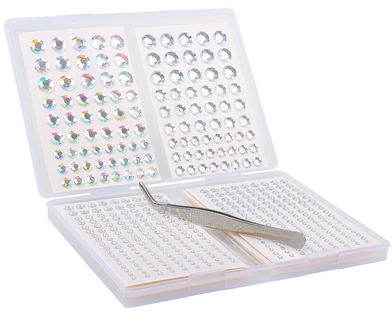10 sheets (Laser silver & silver) self-adhesive rhinestones, a total of 1410 (Sizes include 3, 4, 5, 6, 8, 10, 12 mm) Face Diamonds, 1 tweezers.
