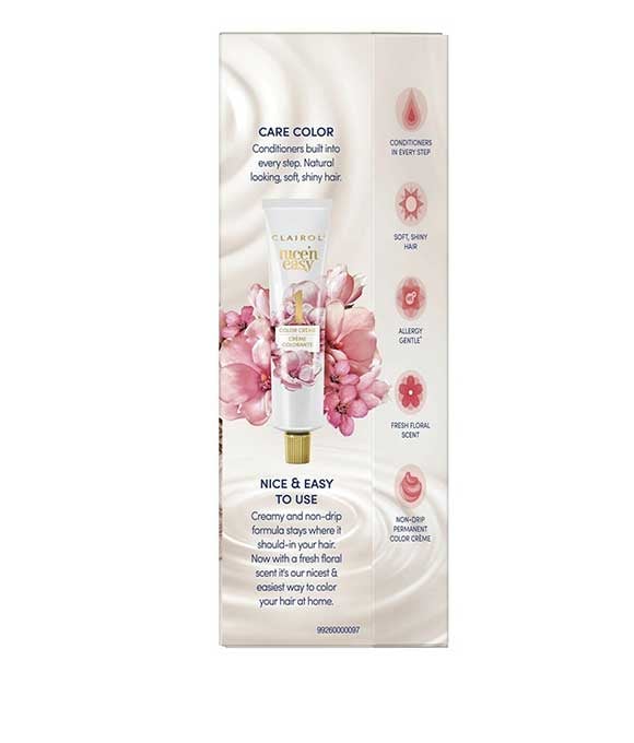 Clairol, Nice N Easy Permanent Colours.Expert blend of subtle tones for multi-tonal colour. Maintains your natural variation and shine. 100 % Grey Coverage.