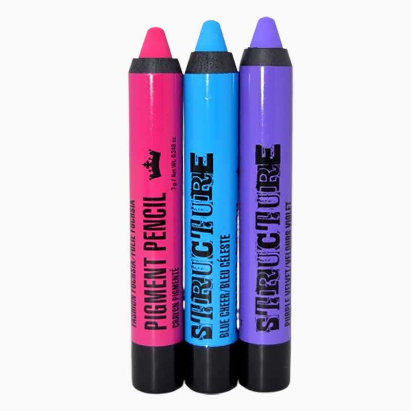 Structure Pigment Pencils. These hair colour pencils are a stroke of genius! PIGMENT PENCILS glide effortlessly over hair strands to deposit vibrant, statement-making pops of colour. Can be used on all hair types; will have less longevity on coarse, dry, damaged hair. Colour appears on both light and dark hair, however, it is most visible on lighter hair. Colour washes out after one or two shampoo.