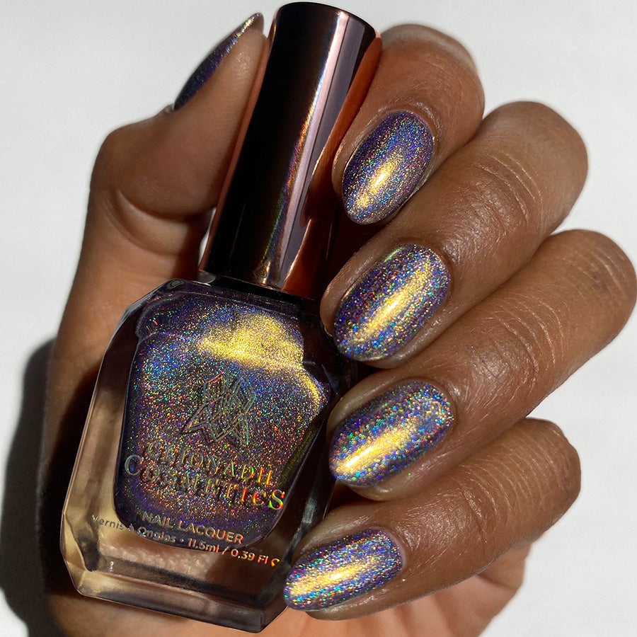 Surrender your nails to the enigmatic allure of this muted mauve base, cloaked in a bold golden sheen and crowned with a mesmerizing linear holographic finish. It's a harmonious clash of subtlety and extravagance!