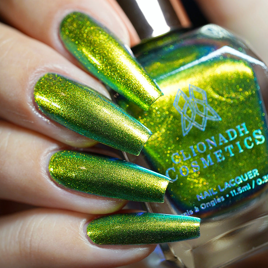Watch as your nails come alive with the iridescence of a stained glass masterpiece, shimmering with every movement with this?multichrome nail polish that casts a spellbinding array of bright gold, green, turquoise, and blue shifts with its shimmer.