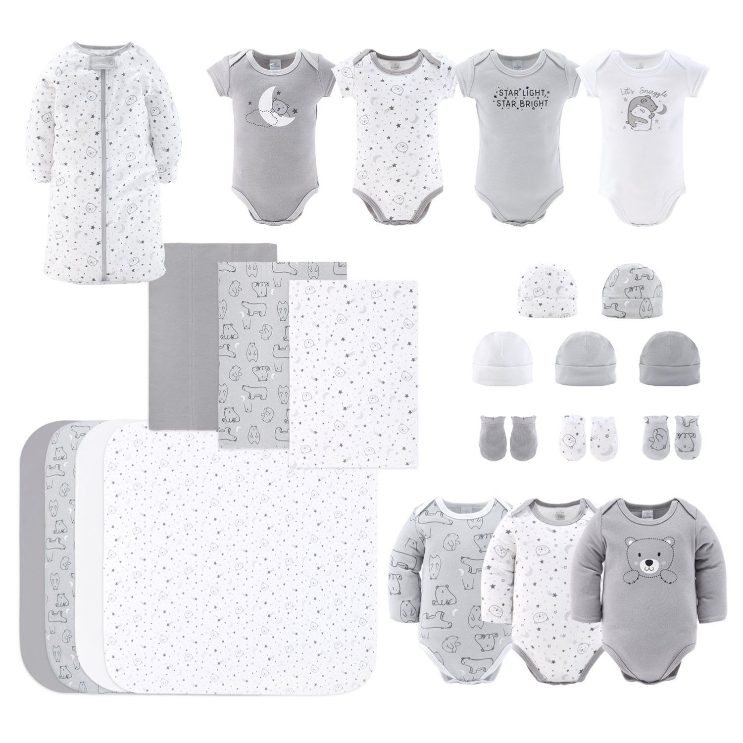 The Celestial Bears 23 Piece Newborn Baby Layette set from The Peanutshell is the perfect gift. It includes all the essential accessories for a new baby. This curated collection includes 4 short sleeved and 3 long sleeved bodysuits, 1 character printed zipper sleep sack, 5 beanies, 3 pairs of scratch prevention mittens, 3 burp cloths and 4 receiving blankets. Our starry celestial print in white and shades of gray pairs perfectly with the sweet sleepy bear coordinate. This charming set is the perfect must-have baby shower gift for new moms. The snuggly sayings are perfect for capturing all baby's first moments and milestones. Our 100% knit cotton pieces are breathable and gentle on soft skin. The generously sized 30” x 30” receiving blankets keep baby safely swaddled and secure. Mix and match the solid and patterned pieces together to create various layered looks for any season.