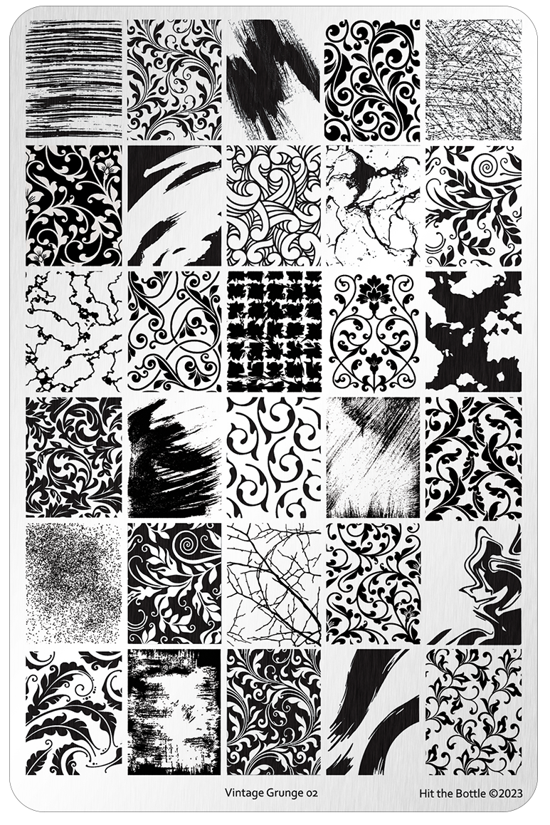 Grit & grime with a touch of vintage class! This stamping plate?is here to give your nails an edgy, unique look. Featuring intricate and ornate patterns, textures, smudges, swirls and more - you'll have loads of fun experimenting with color & style combos! Get ready to make 'em stare.